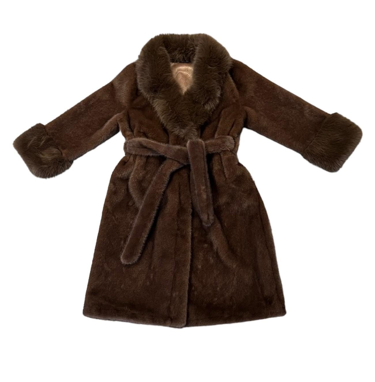 Noma`s nye lekre kåper i fin fuskepels med knytebelte. På kragen og på mansjettene er fuskepelsen mer fluffy.
