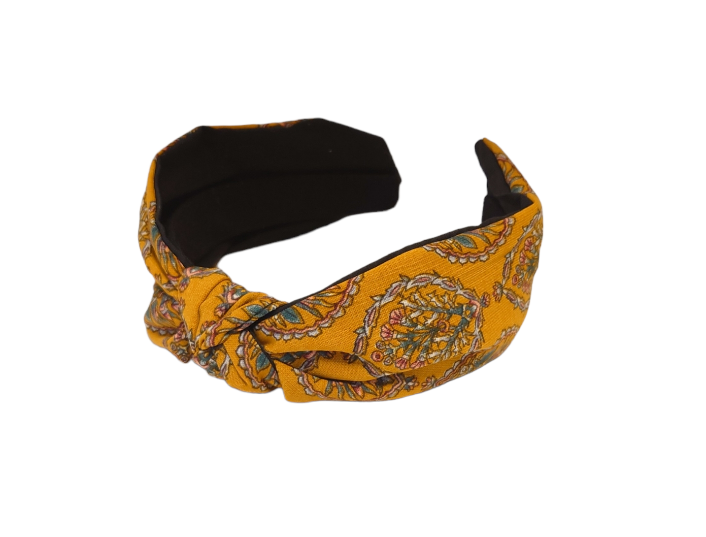 Fine hårbøyler med knute i lekkert mønster. Bredde på det bredeste punktet er ca 8,5 cm. Stoffet kan fint brettes inn nederst ved ørene hvis man ønsker de litt smalere der.