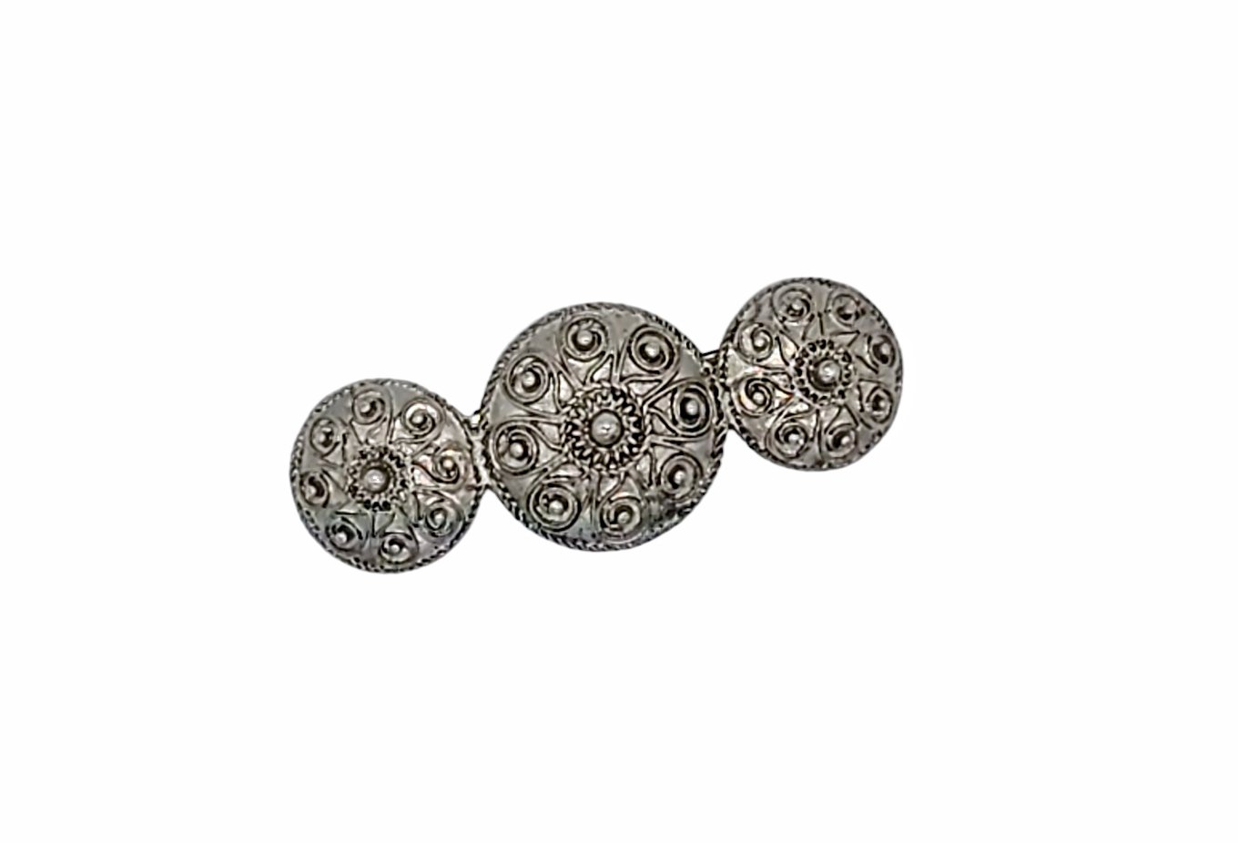Noma`s egendesignede dekorative hårspenner i nikkelfritt sterkt stål. Designet for å passe til våre vakre bunader, festdrakter og stakker. Det er gummi på selve spennen, som gjør at den ikke sklir i håret.