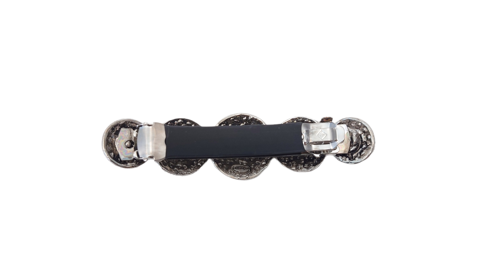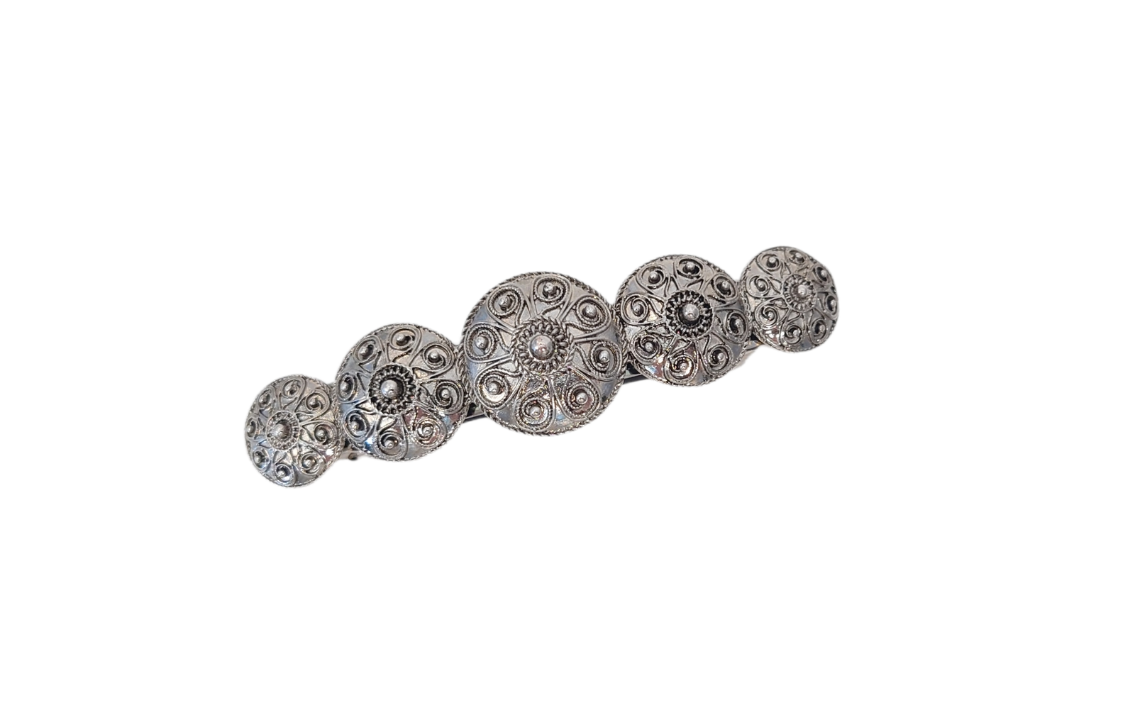 Noma`s egendesignede dekorative hårspenner i nikkelfritt sterkt stål. Designet for å passe til våre vakre bunader, festdrakter og stakker. Det er gummi på selve spennen, som gjør at den ikke sklir i håret.