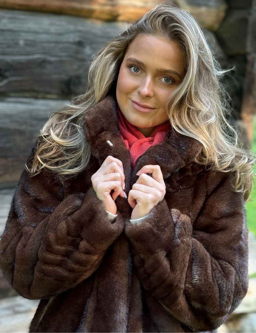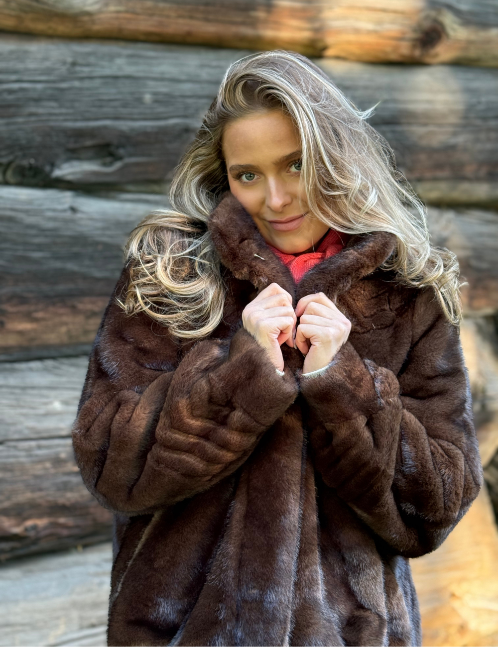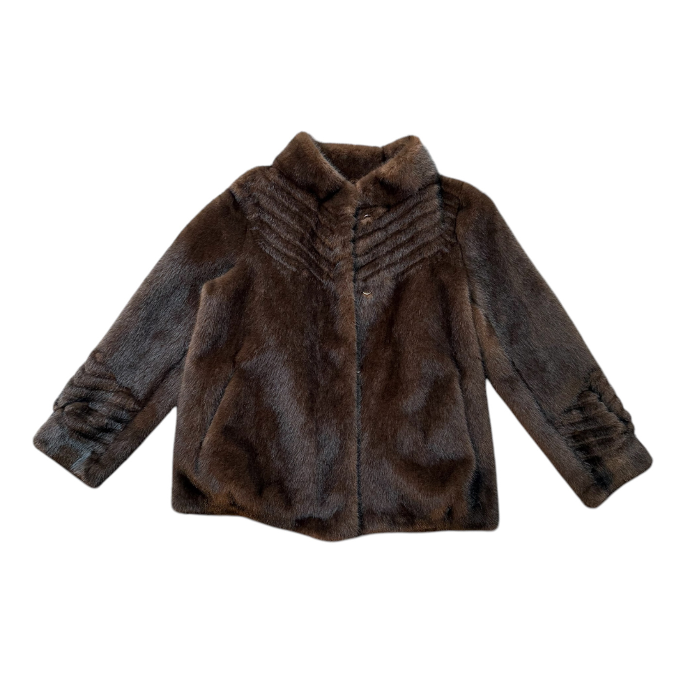 En lekker fuskepels jakke med skårede detaljer på ryggen og på ærmene. Jakken har også legg bak som skaper fine volanger som gir jakken et klassisk og feminint uttrykk.
