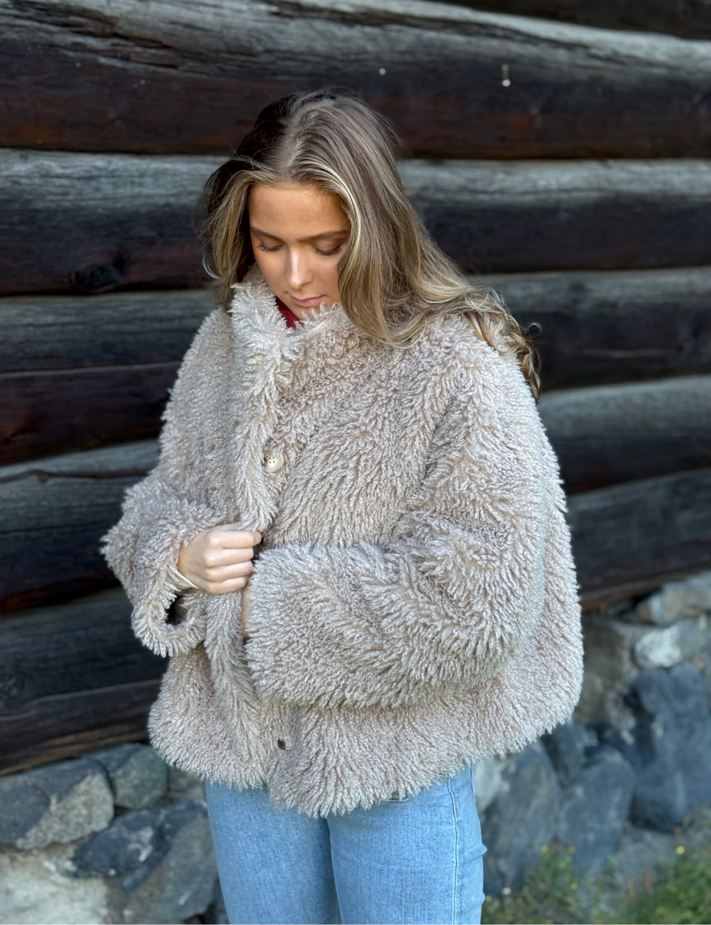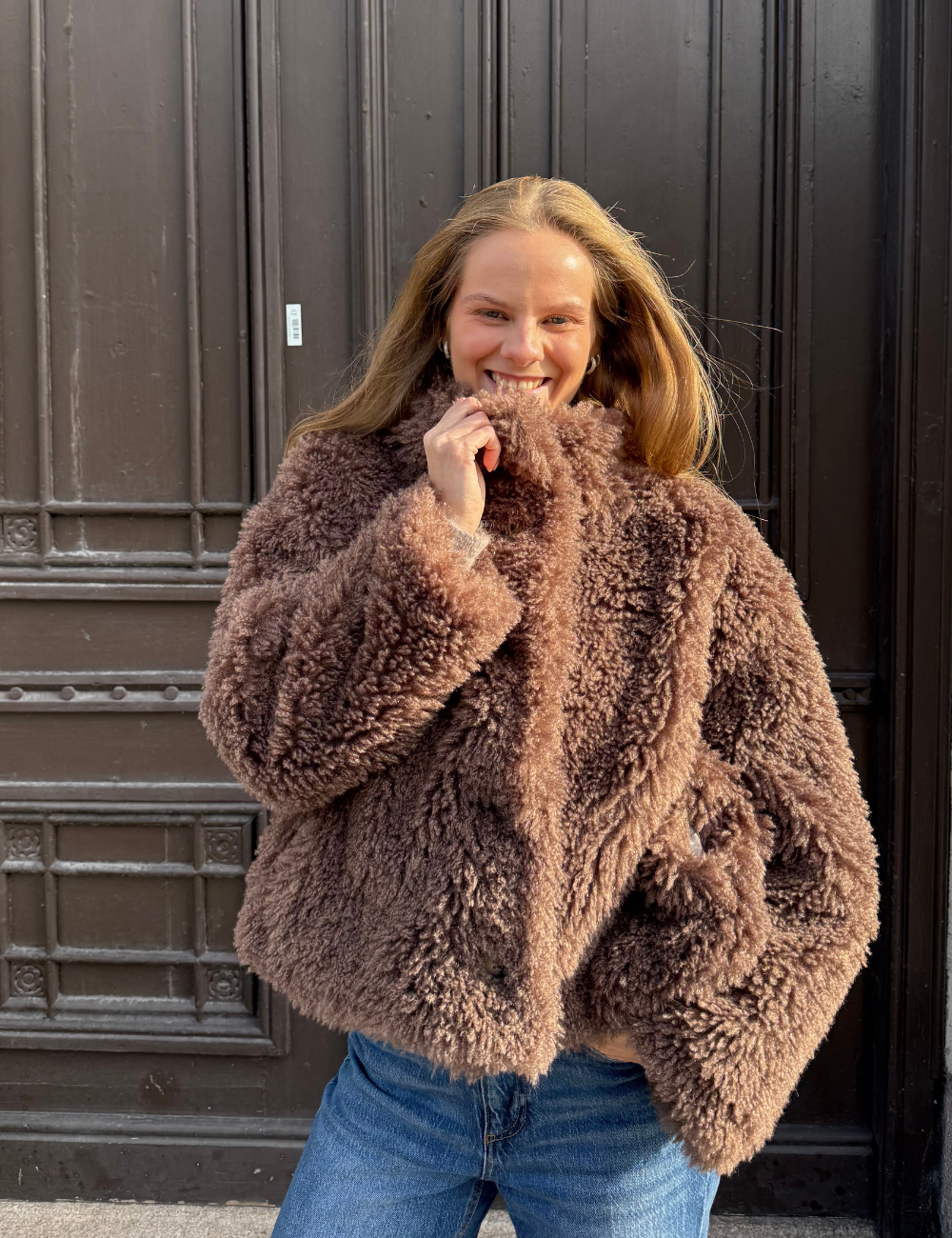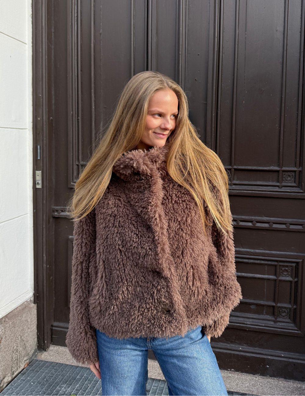 Denne jakken i fuskepels er en litt ny vri på vår elskede fuskepels. Fuskepels jakke er noe vi elsker, og denne er intet unntak. En røff og kul jakke med knapper langs hele. Med en stor krage og oversized look er dette garantert din nye favoritt.
