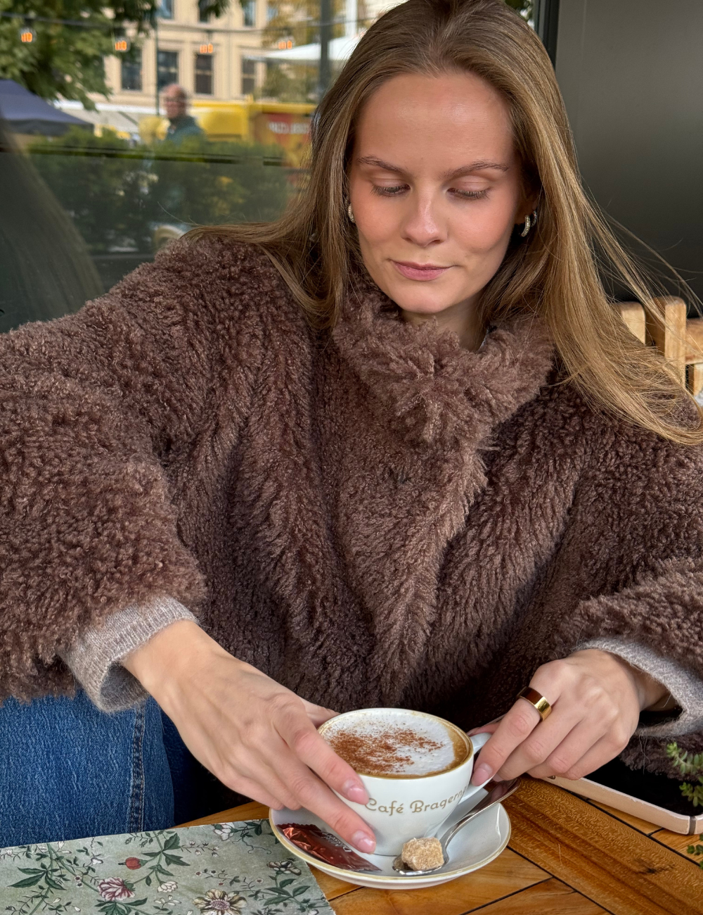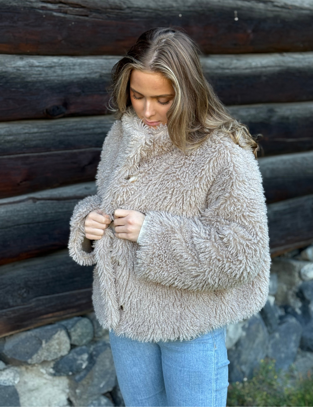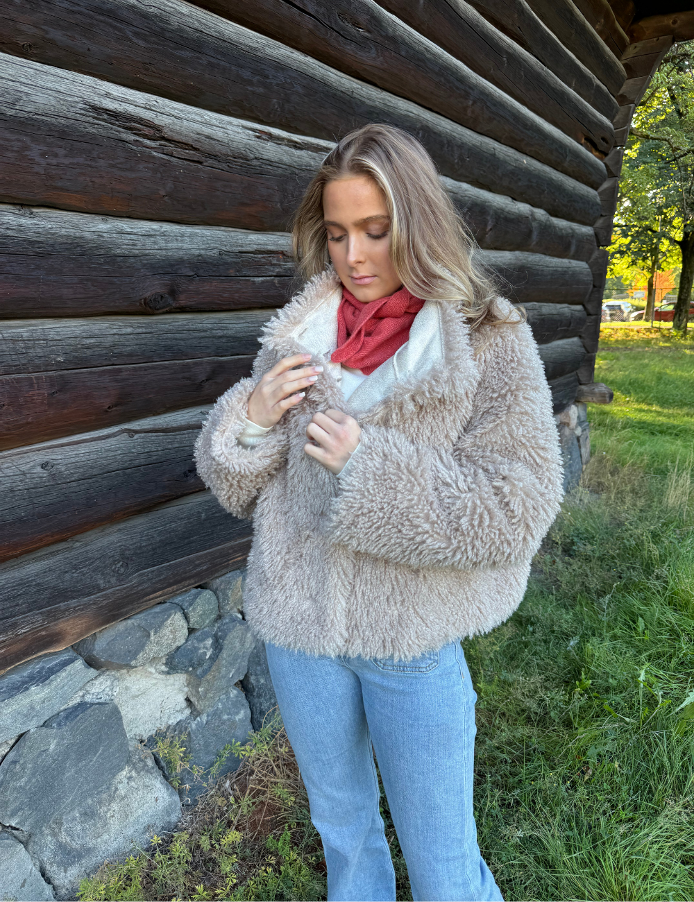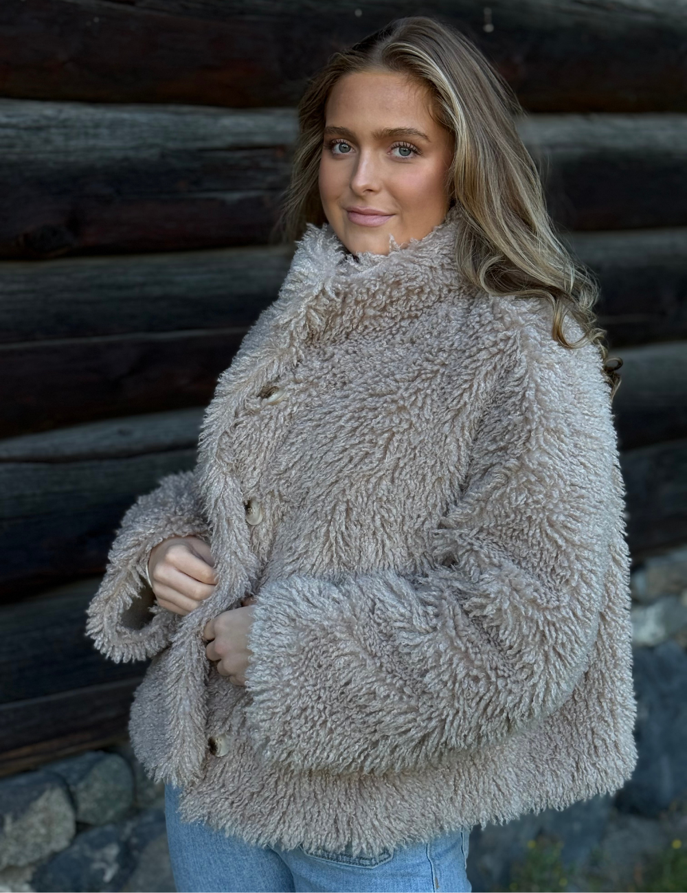Denne jakken i fuskepels er en litt ny vri på vår elskede fuskepels. Fuskepels jakke er noe vi elsker, og denne er intet unntak. En røff og kul jakke med knapper langs hele. Med en stor krage og oversized look er dette garantert din nye favoritt.