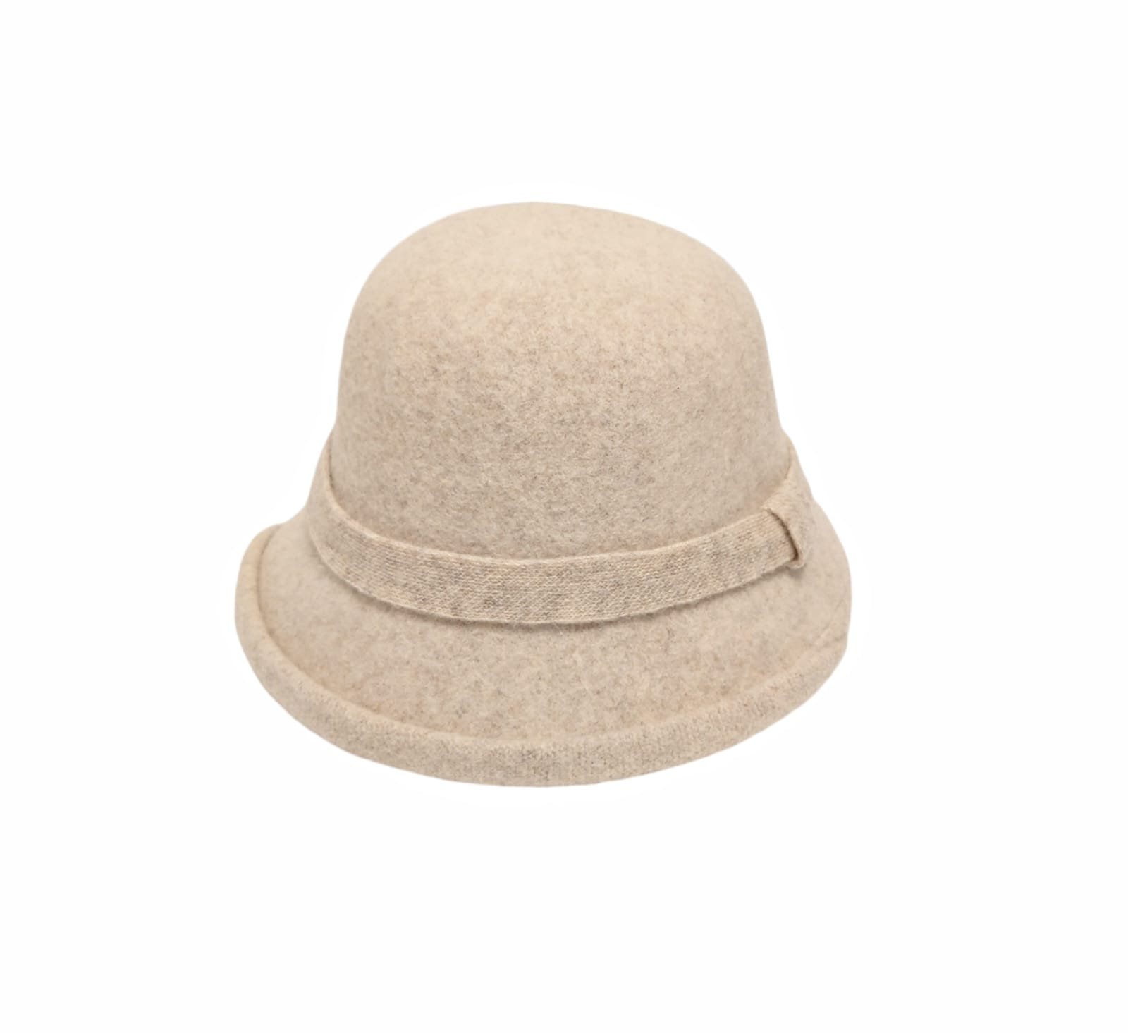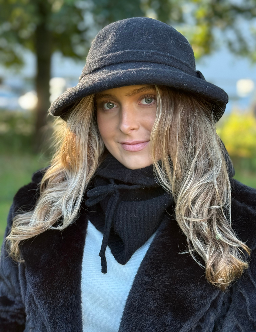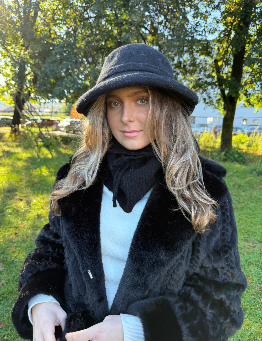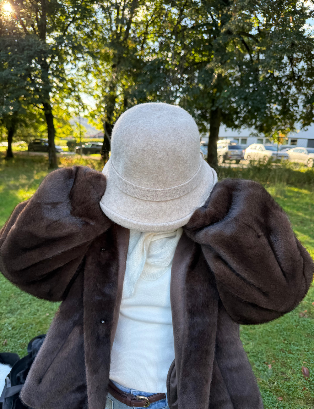 Nydelig Noma bøttehatt i myk ullmiks med strikket bånd.