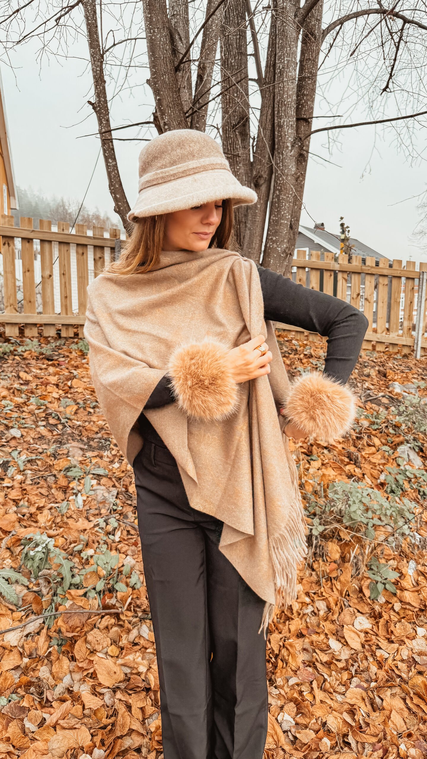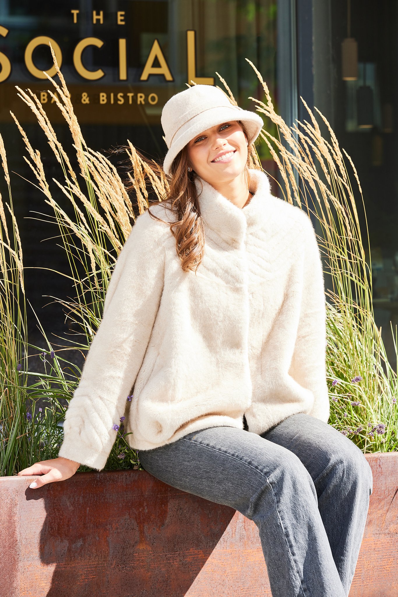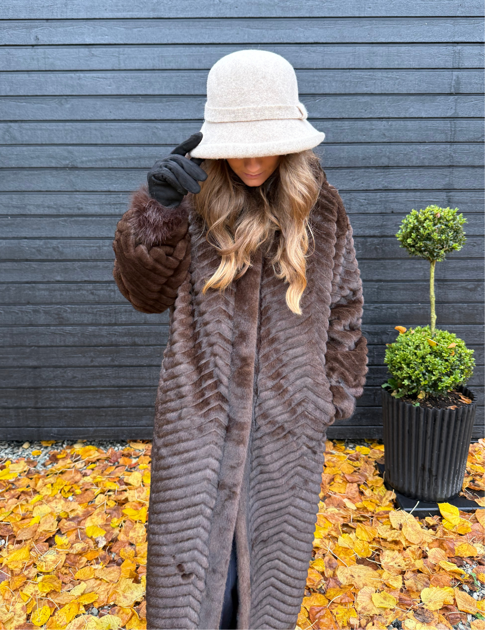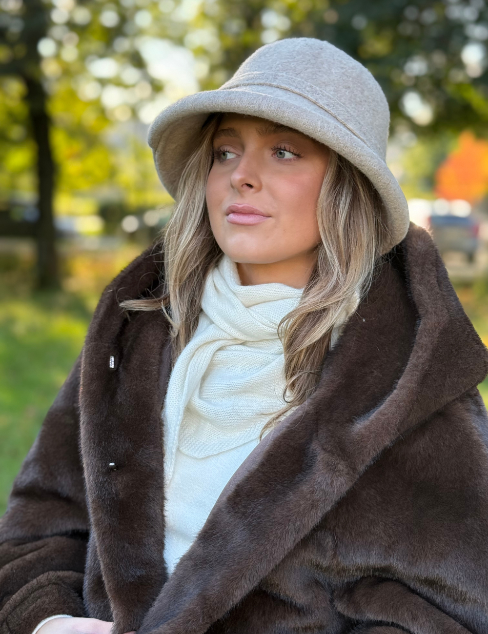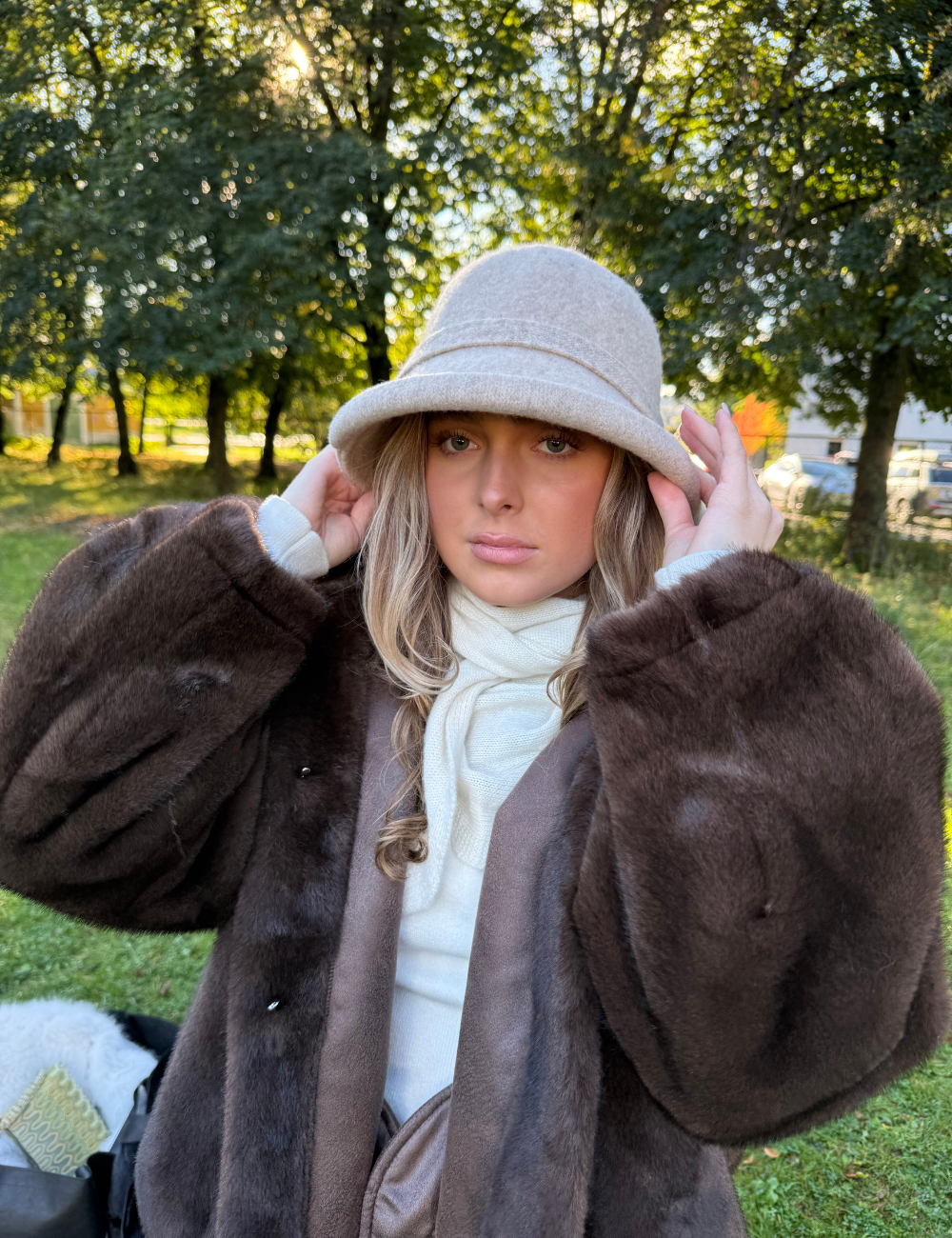 Nydelig Noma bøttehatt i myk ullmiks med strikket bånd.
